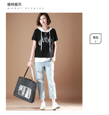 拼接显瘦;上衣半袖纯棉体恤;中长款;宽松休闲;带帽;短T;女
